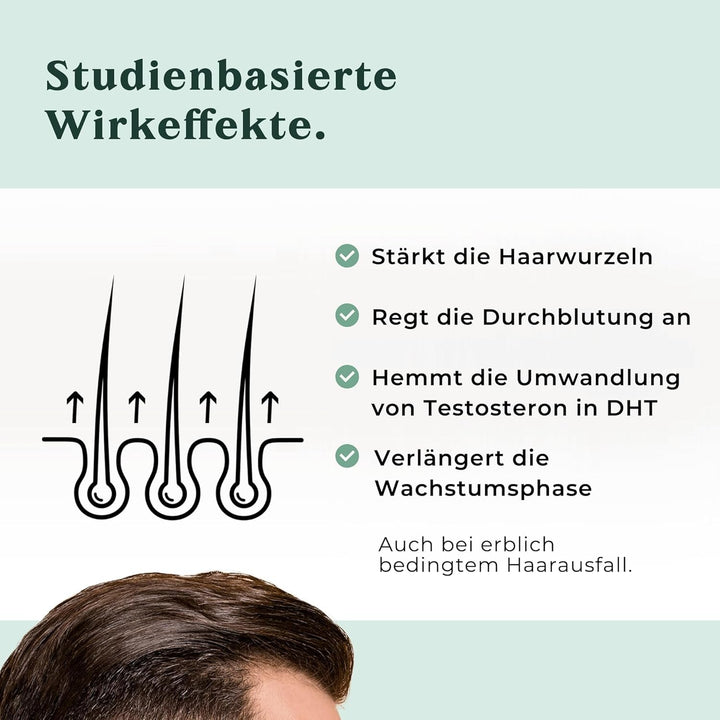 Rootbiotec hemmt das 5α-Reduktase-II-Enzym, das für die Testosteron-Umwandlung in Dihydrotestosteron (DHT) erforderlich ist. Koffein blockiert wiederum DHT. Die hohen DHT -Konzentrationen sind die Hauptursache für erbliche Haarausfall.
